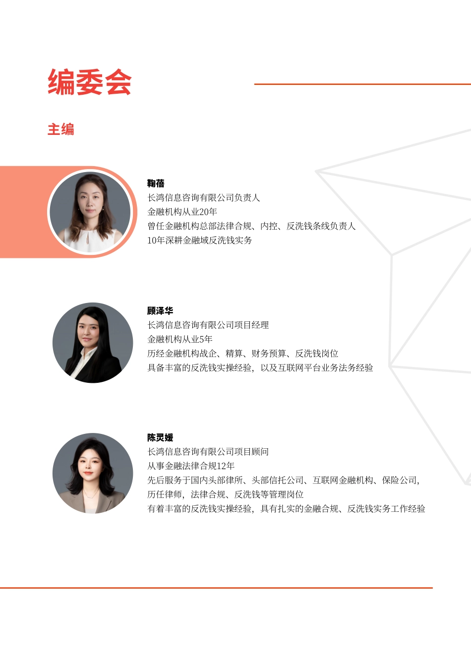 反洗钱检查⼯作指引第⼀版2023主编鞠蓓⻓鸿信息咨询有限公司负责⼈⾦融机构从业20年曾任⾦融机构总部法律合规、内控、反洗钱条线负责⼈10年深耕⾦融域反洗钱实务顾泽华⻓鸿信息咨询有限公司项⽬经理⾦融机构从业5...