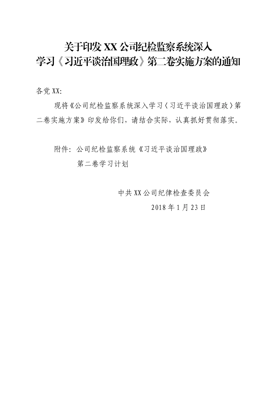 关于印发XX公司纪检监察系统深入学习《习近平谈治国理政》第二卷实施方案的通知各党XX:现将《公司纪检监察系统深入学习〈习近平谈治国理政〉第二卷实施方案》印发给你们,请结合实际,认真抓好贯彻落实。附件:...