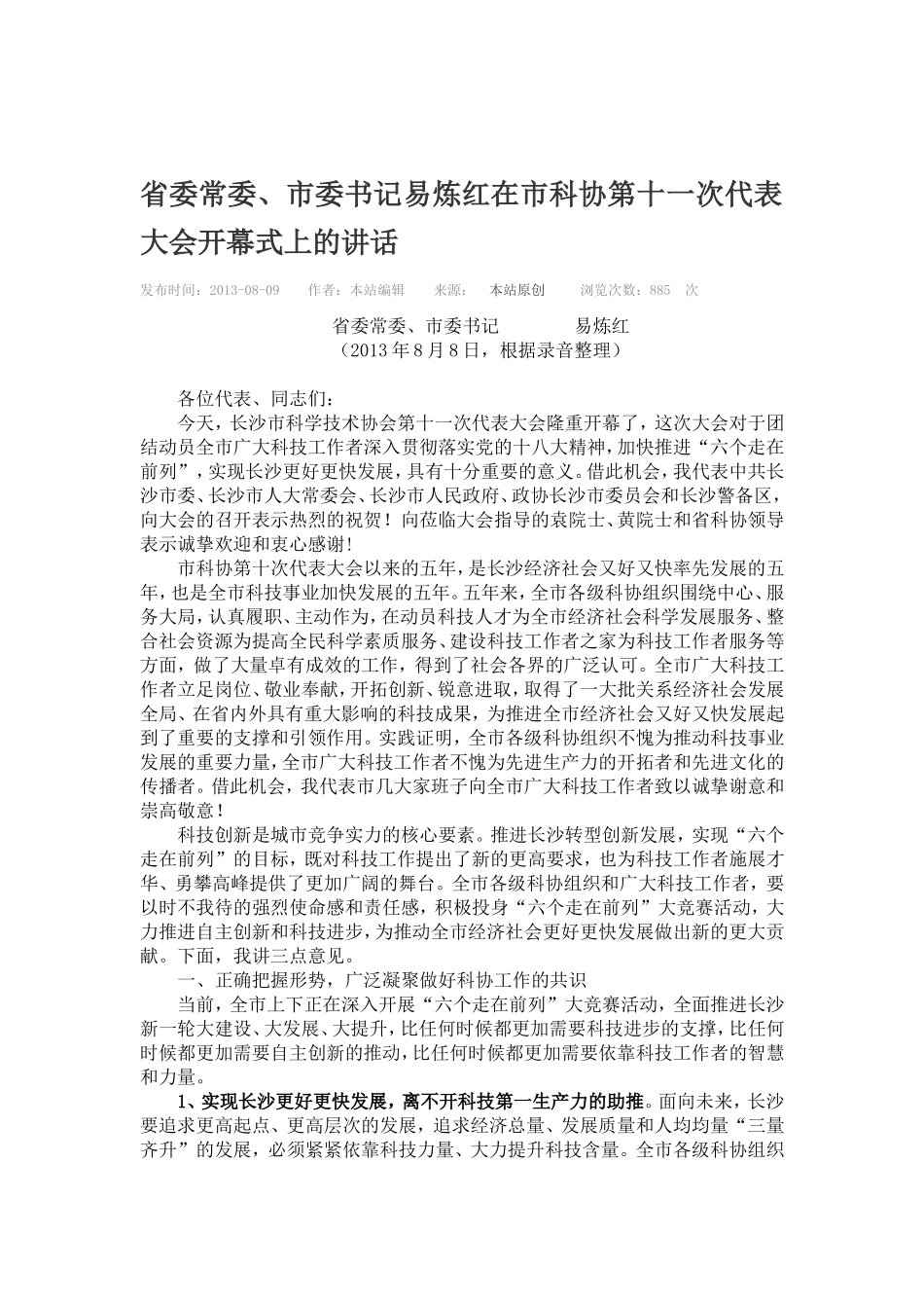 省委常委、市委书记易炼红在市科协第十一次代表大会开幕式上的讲话发布时间:2013-08-09作者:本站编辑来源:本站原创浏览次数:885次省委常委、市委书记易炼红(2013年8月8日,根据录音整理)各位代表、同志们:...