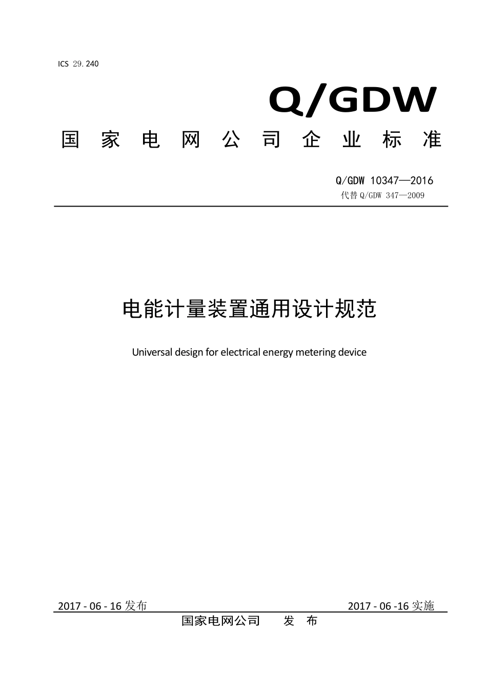 电能计量装置通用设计规范Universaldesignforelectricalenergymeteringdevice2017-06-16发布2017-06-16实施国家电网公司发布ICS29.240Q/GDW国家电网公司企业标准Q/GDW10347—2016代替Q/GDW347—2009Q/GDW10347—2...