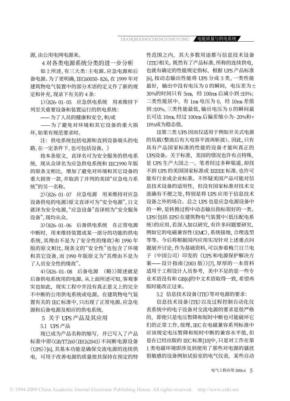 电气工程应用2006.6摘要国家标准将负荷按重要程度分为3级,IEC标准将负荷分为2类(应急负荷和正常工作负荷)和电源分为3类(主电源、应急电源、后备电源),本文对此进行对比分析,认为IEC标准的定义和措施都很明...