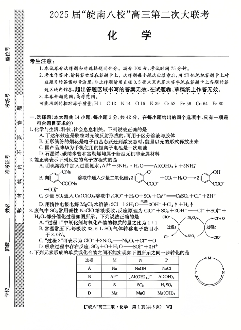 安徽省皖南八校2024-2025学年高三上学期第二次大联考化学.pdf_第2页
