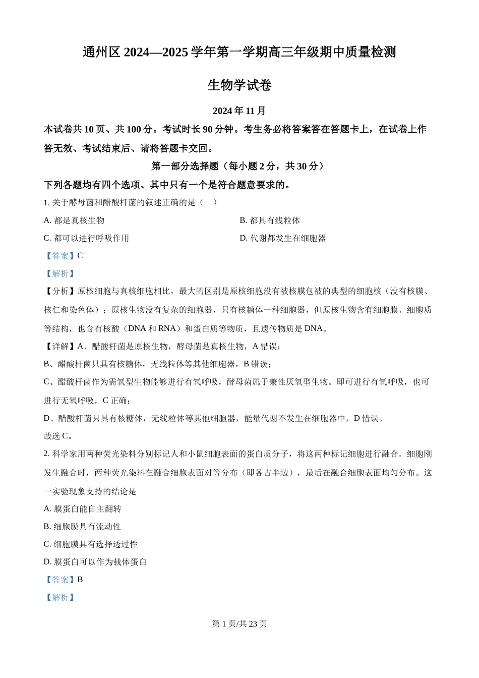 通州区2024—2025学年第一学期高三年级期中质量检测生物学试卷2024年11月本试卷共10页、共100分。考试时长90分钟。考生务必将答案答在答题卡上,在试卷上作答无效、考试结束后、请将答题卡交回。第一部分选择题(...