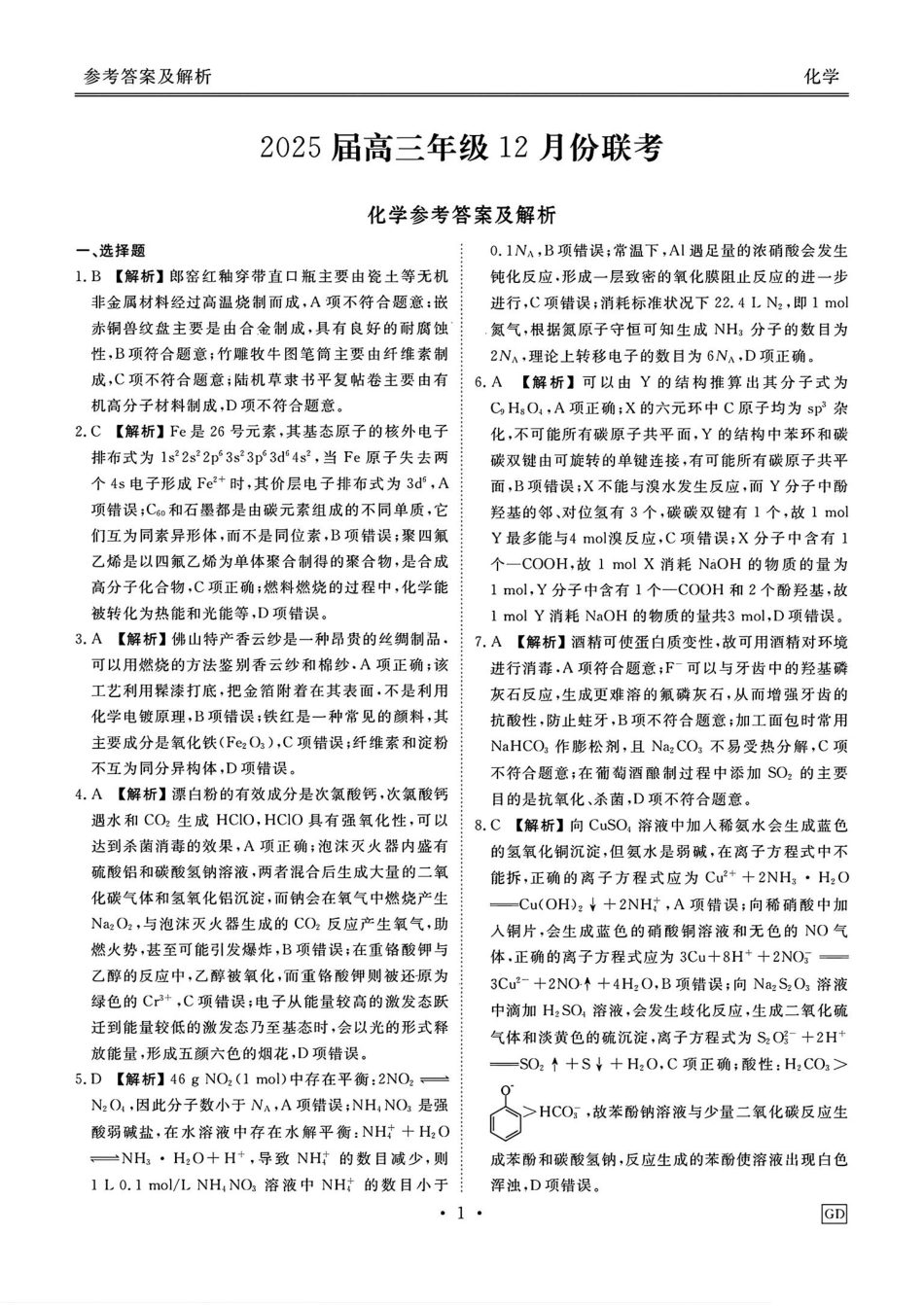 广东省衡水金卷2025届高三上学期12月联考化学答案.pdf_第1页