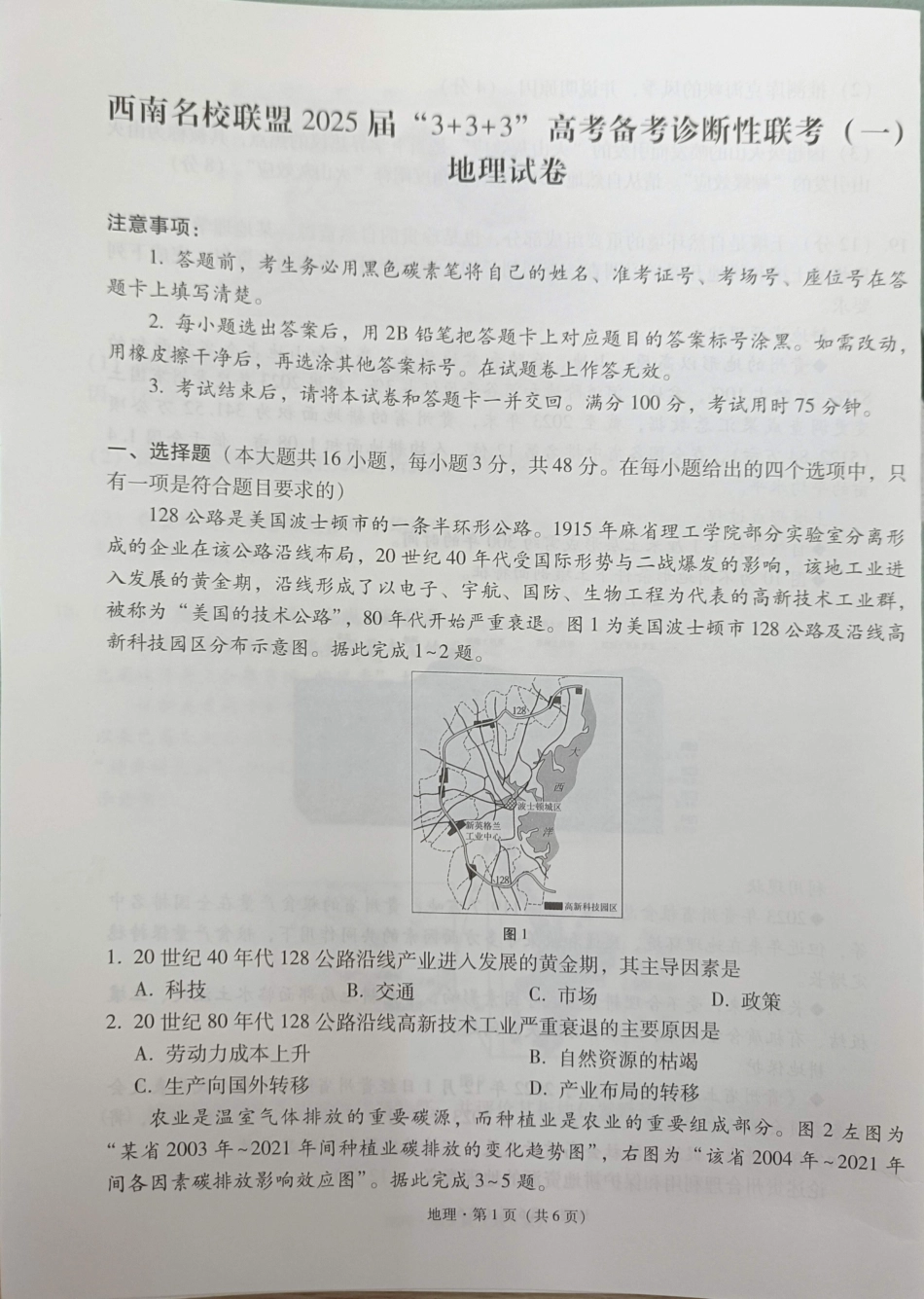 贵州省西南名校联盟2025届“3+3+3高考备考诊断性联考(一)地理试卷.pdf