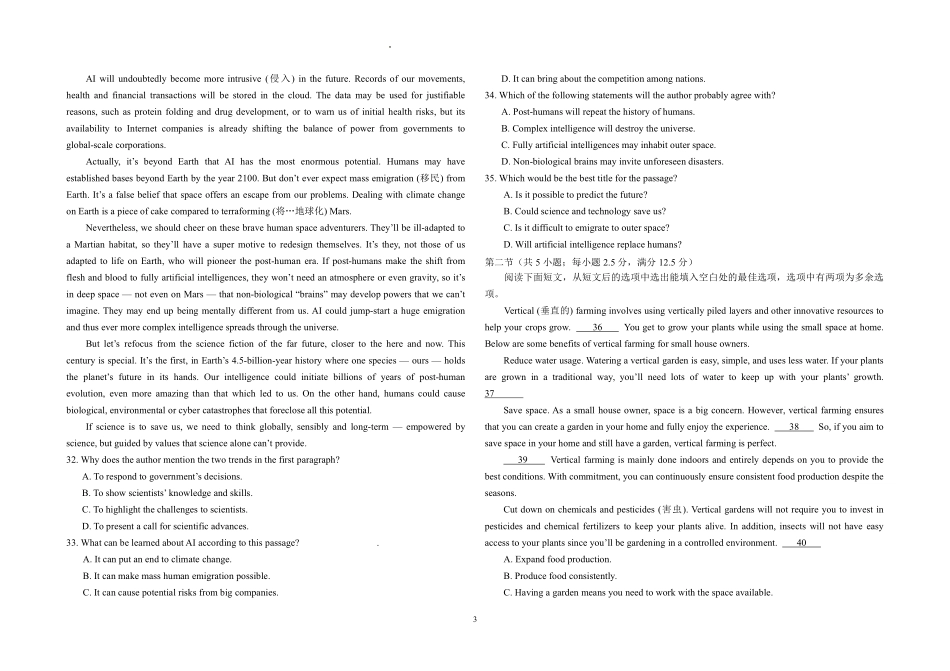 学科网(北京)股份有限公司12024-2025学年上学期东北师大附中英语试卷高三年级第三次摸底考试第一部分听力(1-20小题)在笔试结束后进行。第二部分阅读(共两节,满分50分)第一节(共15小题;每小题2.5分,满分...