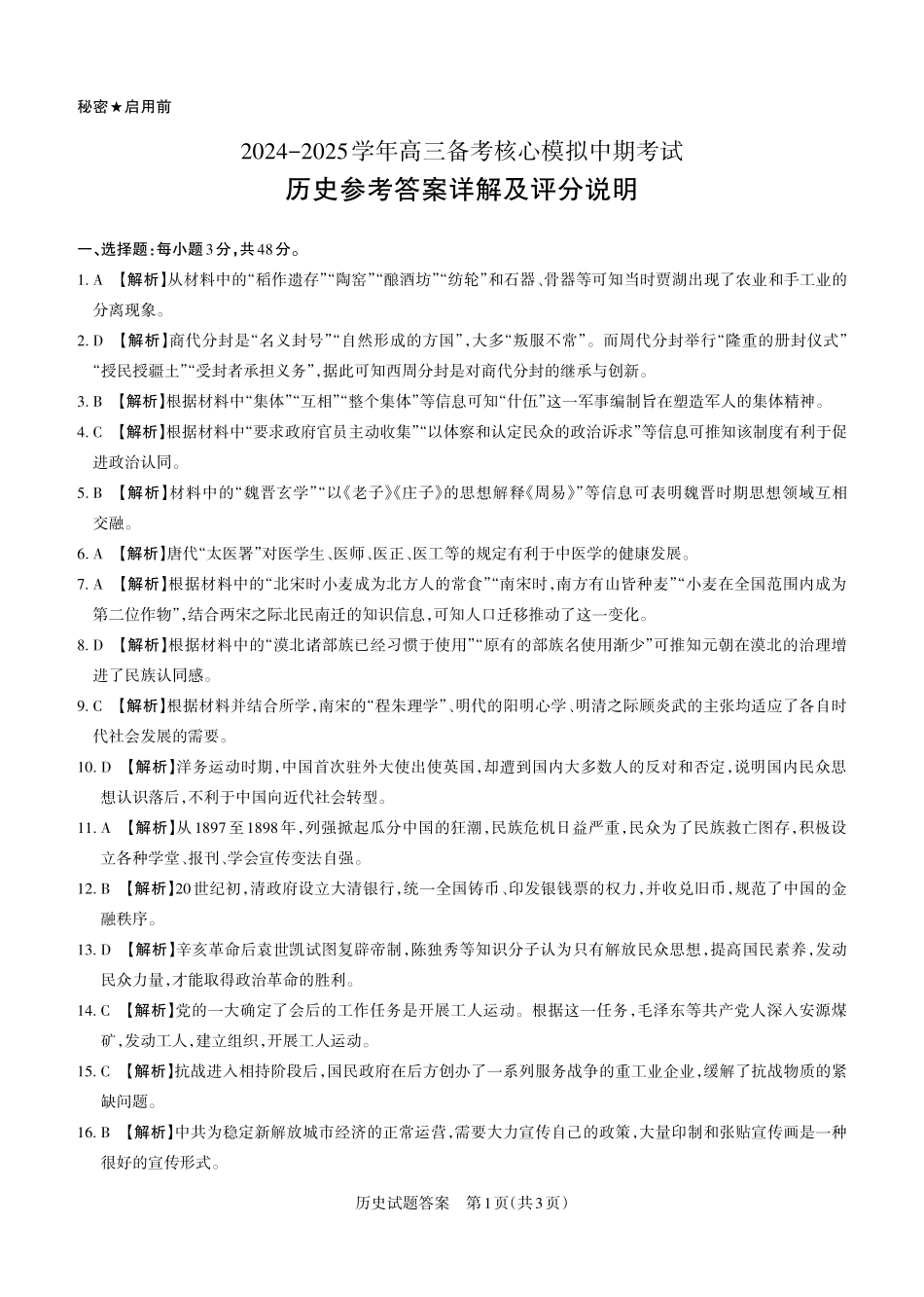 山西思而行2024-2025学年高三备考核心模拟中期考试答案与详解  历史.pdf_第1页