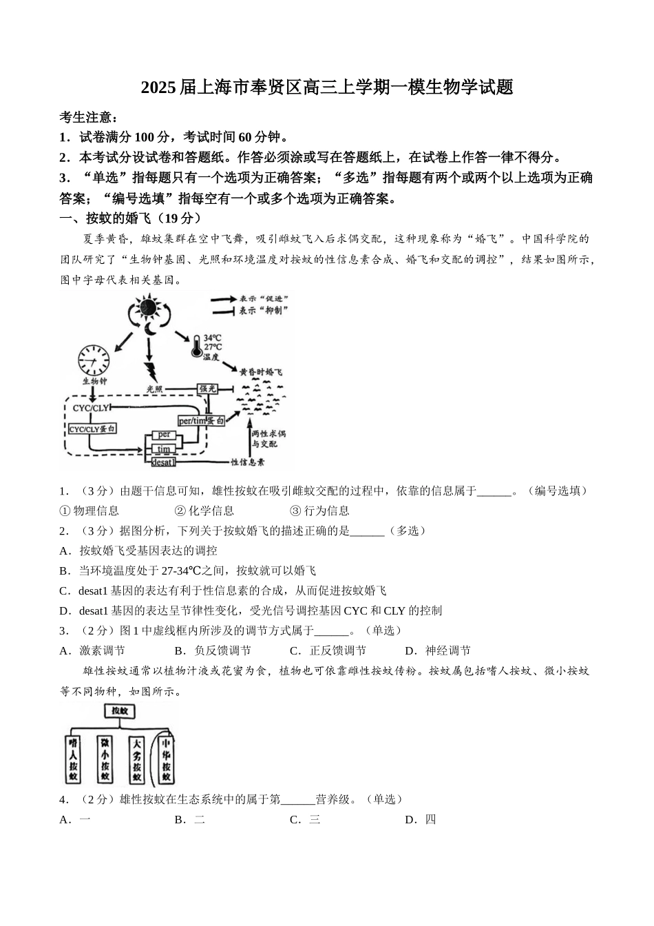 2025届上海市奉贤区高三上学期一模生物学试题考生注意:1.试卷满分100分,考试时间60分钟。2.本考试分设试卷和答题纸。作答必须涂或写在答题纸上,在试卷上作答一律不得分。3.“单选”指每题只有一个选项为正...