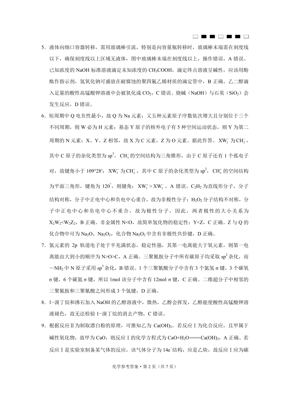 化学参考答案·第1页(共7页)化学参考答案一、选择题:本题共14小题,每小题3分。题号1234567答案BDADBAB题号891011121314答案CBDDCDD【解析】1.单晶硅属于共价晶体,A正确。酚醛树脂是由酚类和甲醛缩聚成的,...