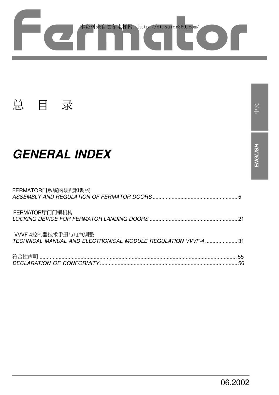 Rev.:06.2002操作手册VVVF-4INSTRUCTIONSBROCHUREVVVF-4E198022本资料来自赛尔电梯网:http://dt.saier360.com/中文ENGLISH06.2002FERMATOR门系统的装配和调校ASSEMBLYANDREGULATIONOFFERMATORDOORS................