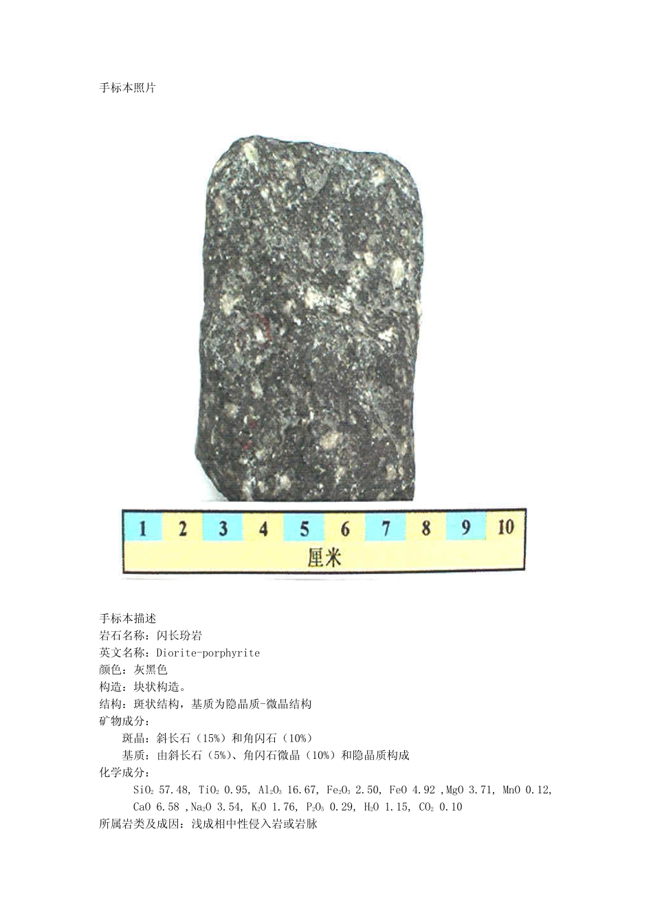 手标本照片手标本描述岩石名称:闪长玢岩英文名称:Diorite-porphyrite颜色:灰黑色构造:块状构造。结构:斑状结构,基质为隐晶质-微晶结构矿物成分:斑晶:斜长石(15%)和角闪石(10%)基质:由斜长石(5%)、...