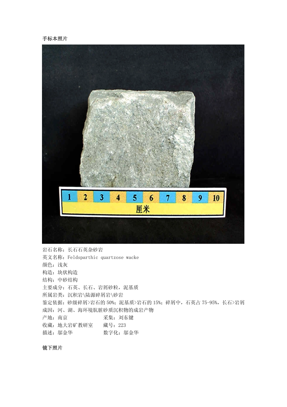 手标本照片岩石名称:长石石英杂砂岩英文名称:Feldsparthicquartzosewacke颜色:浅灰构造:块状构造结构:中砂结构主要成分:石英、长石、岩屑砂粒,泥基质所属岩类:沉积岩\陆源碎屑岩\砂岩鉴定依据:砂级碎屑>...