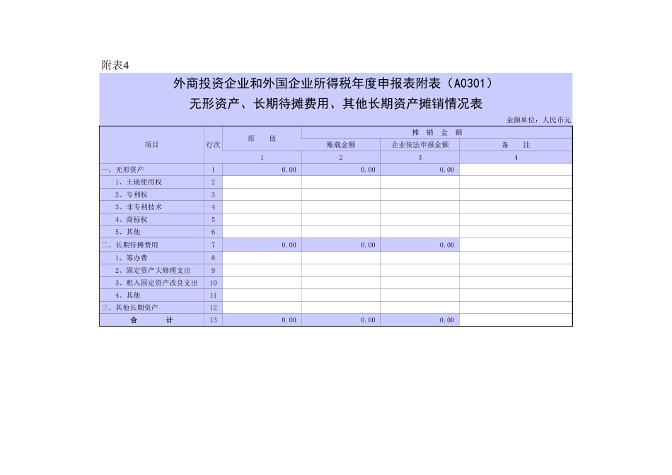 无形资产、长期待摊费用、其他长期资产摊销情况表金额单位:人民币元项目行次原值摊销金额账载金额企业依法申报金额备注1234一、无形资产10.000.000.0023456二、长期待摊费用70.000.000.00891011三、其他长期资产...