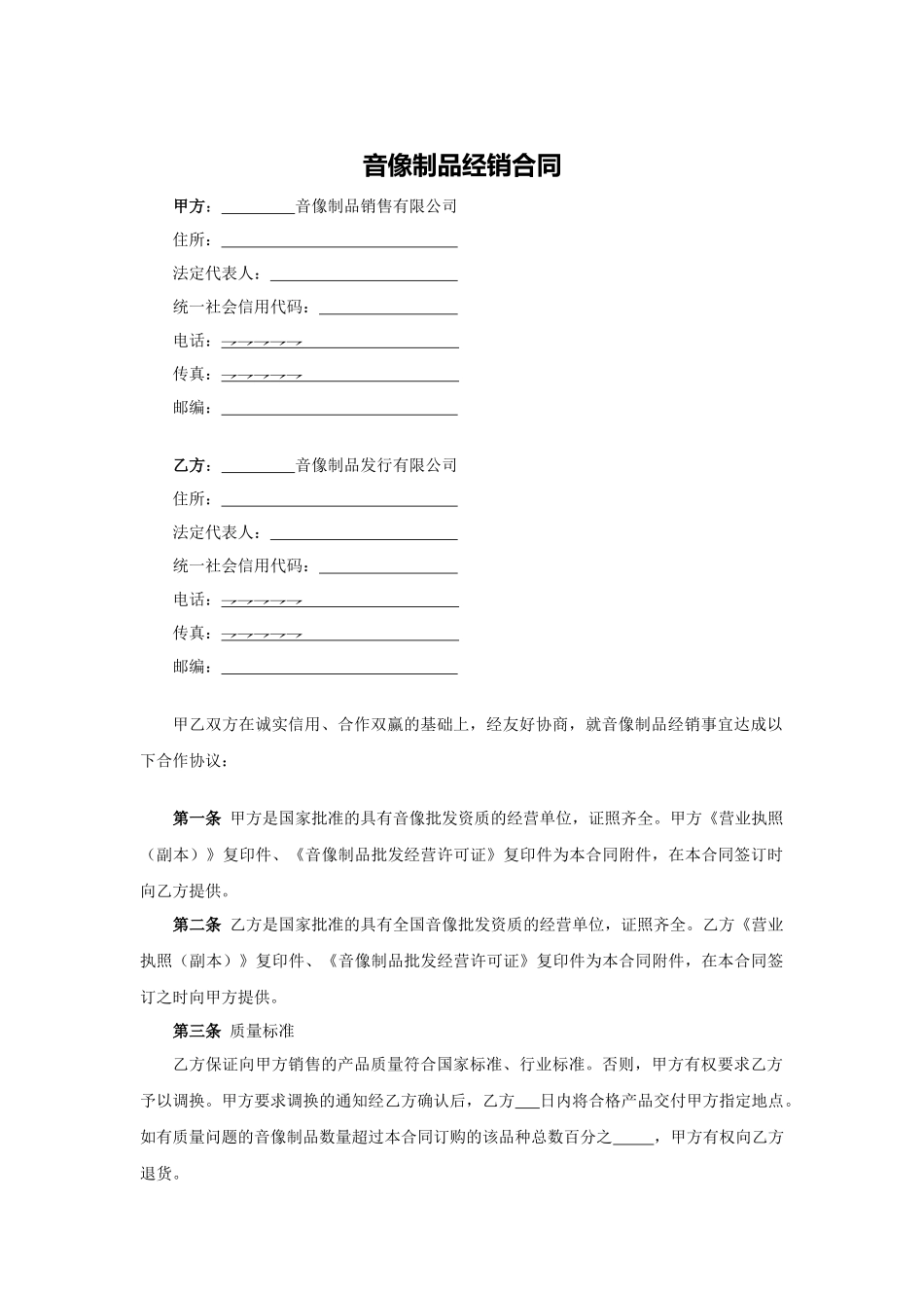 音像制品经销合同甲方:音像制品销售有限公司住所:法定代表人:统一社会信用代码:电话:传真:邮编:乙方:音像制品发行有限公司住所:法定代表人:统一社会信用代码:电话:传...