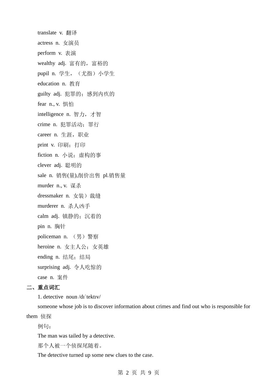 Unit6Detectives知识精讲一、必背词汇detectiven.侦探,警探Britishadj.英国的;英国人的observev.观察humourousadj.滑稽有趣的,有幽默感的degreen.(大学)学位;度数;程度wiseadj.充满智慧的solutionn.解决办...