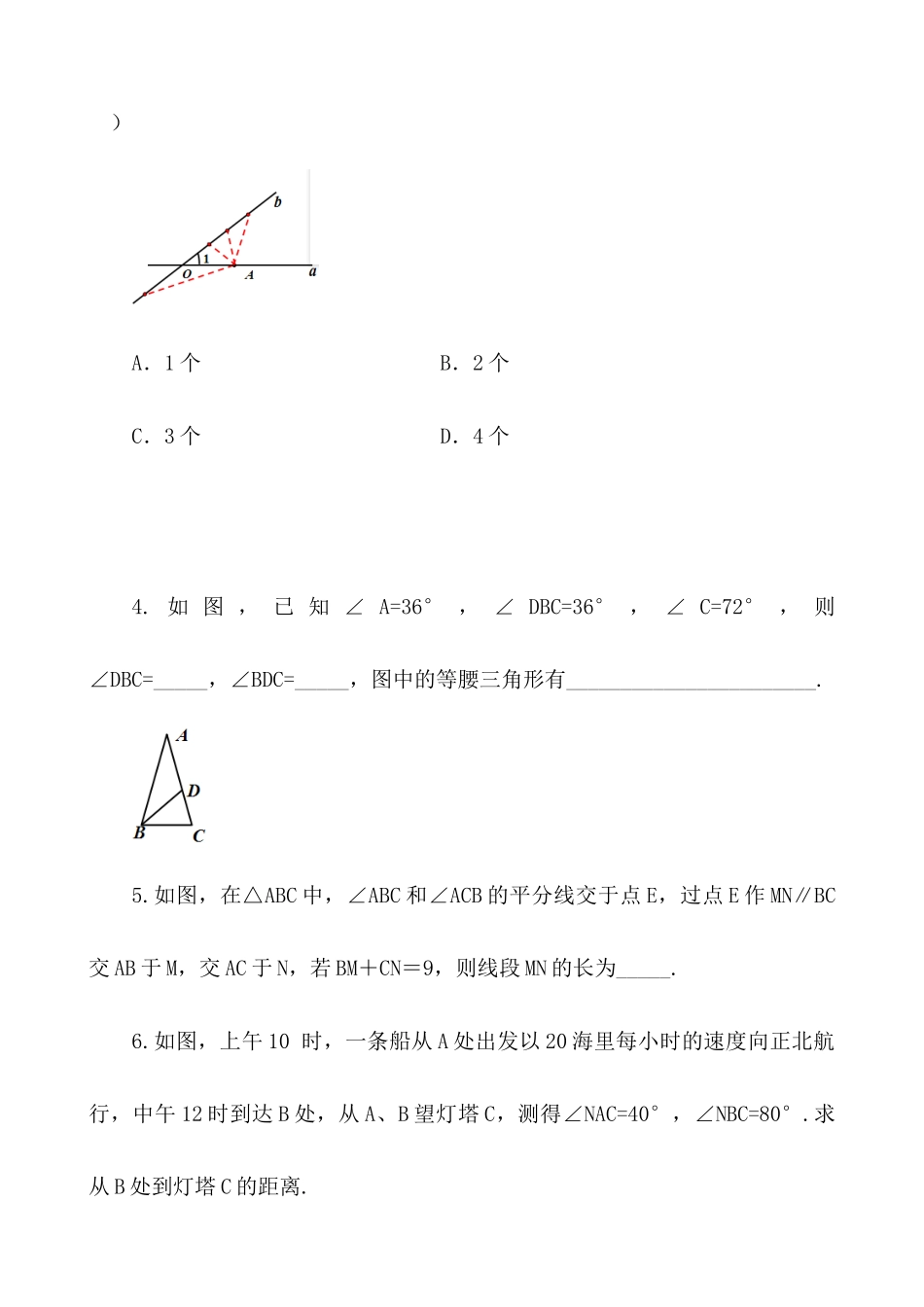 第十三章轴对称13.3等腰三角形13.3.1等腰三角形第2课时1.如图,在△ABC中,AB=AC,∠A=36°,BD,CE分别是∠ABC,∠BCD的角平分线,则图中的等腰三角形有()A.5个B.4个C.3个D.2个2.一个三角形的一个外角为13...
