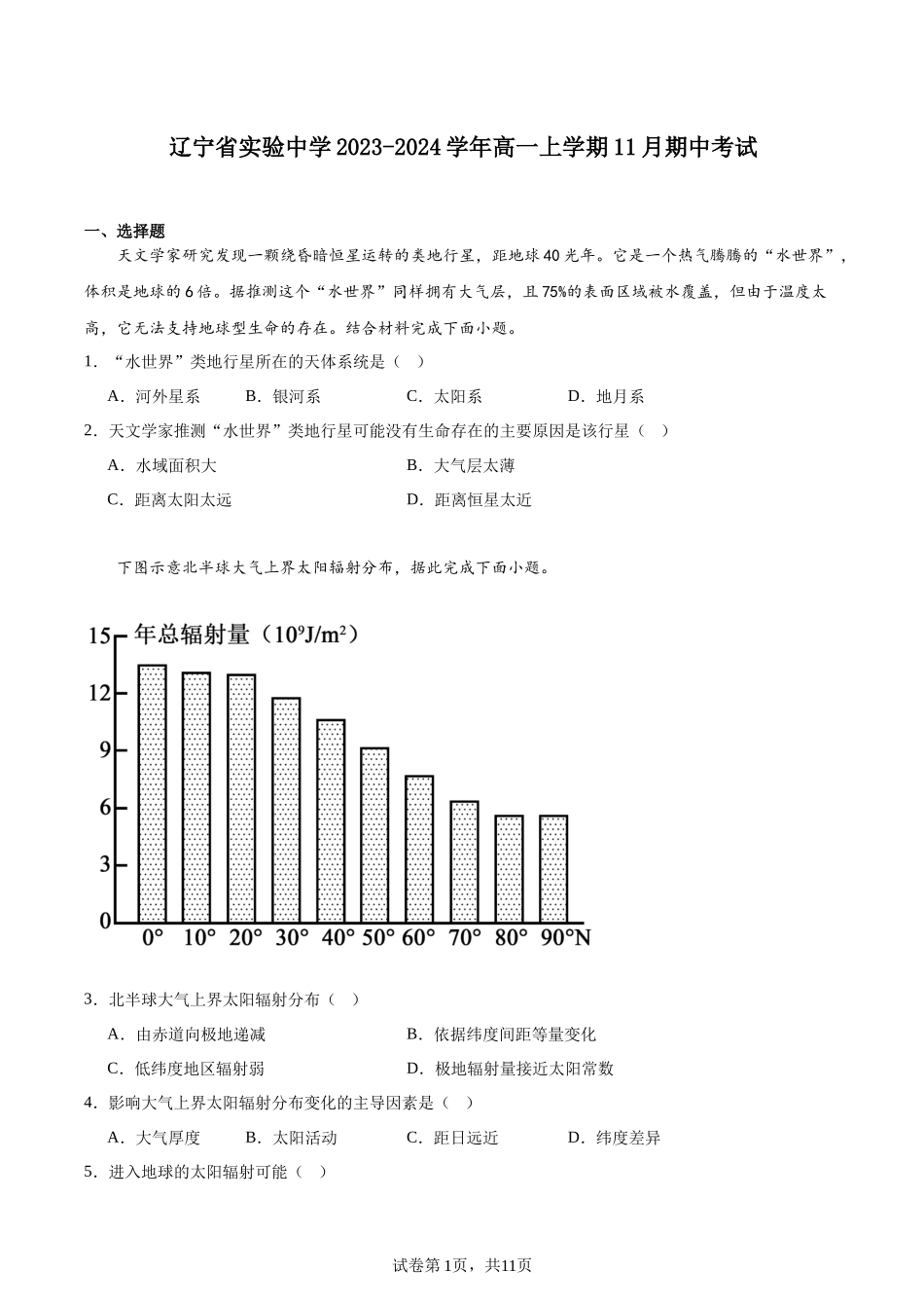 辽宁省实验中学2023-2024学年高一上学期11月期中考试一、选择题天文学家研究发现一颗绕昏暗恒星运转的类地行星,距地球40光年。它是一个热气腾腾的“水世界”,体积是地球的6倍。据推测这个“水世界”同样拥有大...
