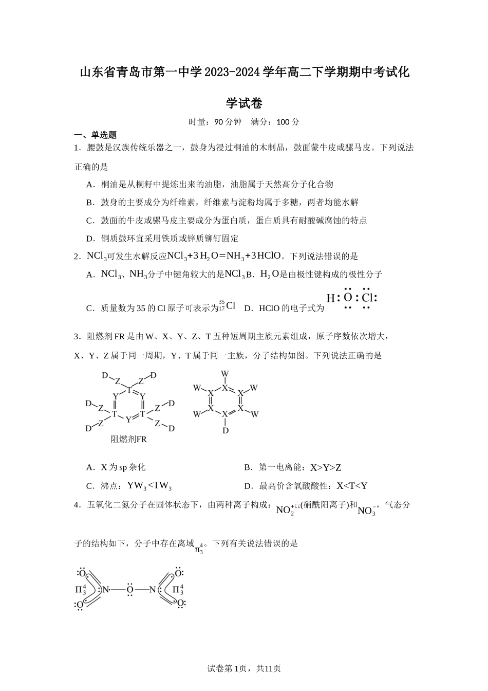 山东省青岛市第一中学2023-2024学年高二下学期期中考试化学试卷含答案.docx_第1页