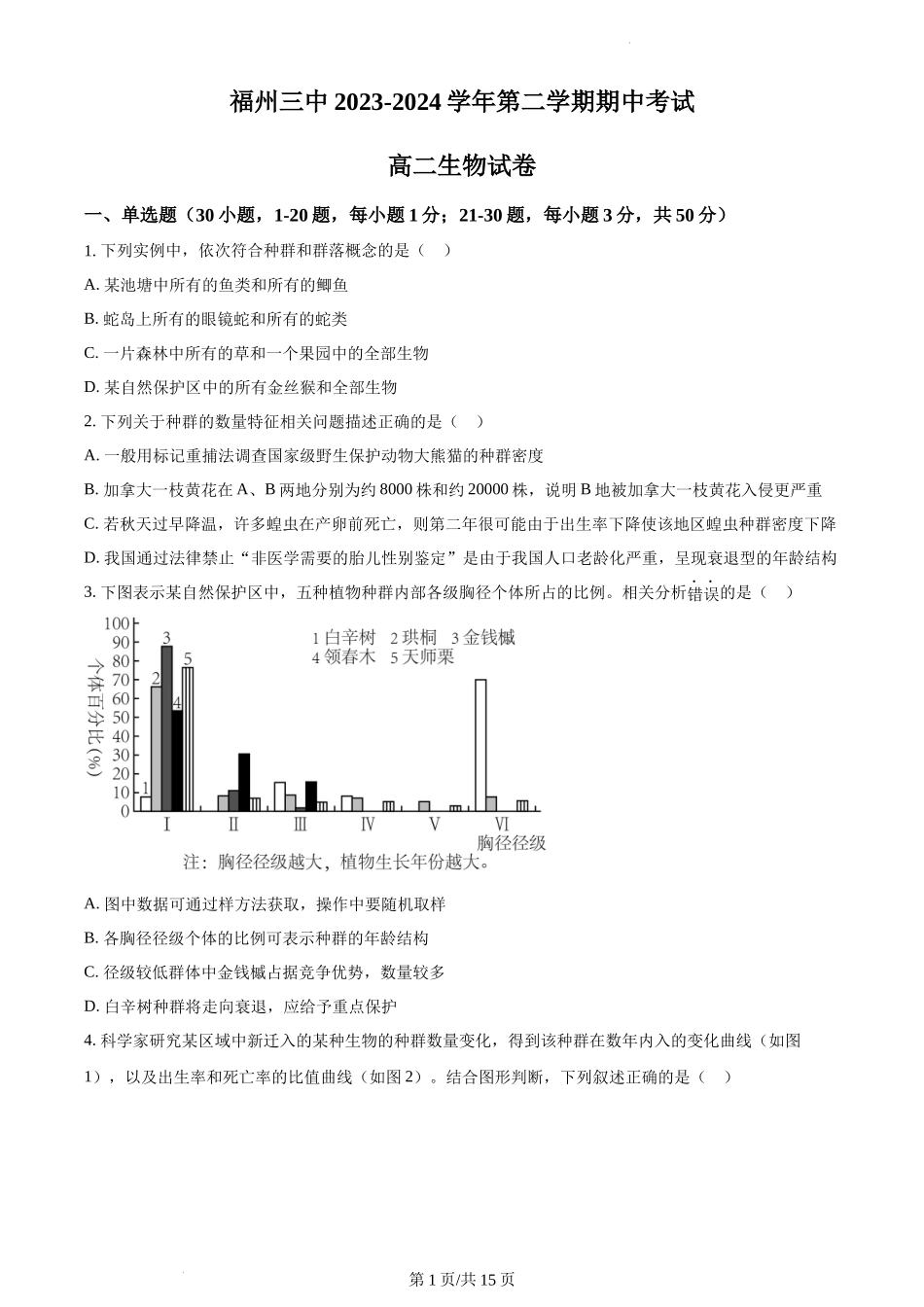 福州三中2023-2024学年第二学期期中考试高二生物试卷一、单选题(30小题,1-20题,每小题1分;21-30题,每小题3分,共50分)1.下列实例中,依次符合种群和群落概念的是()A.某池塘中所有的鱼类和所有的鲫鱼B.蛇...