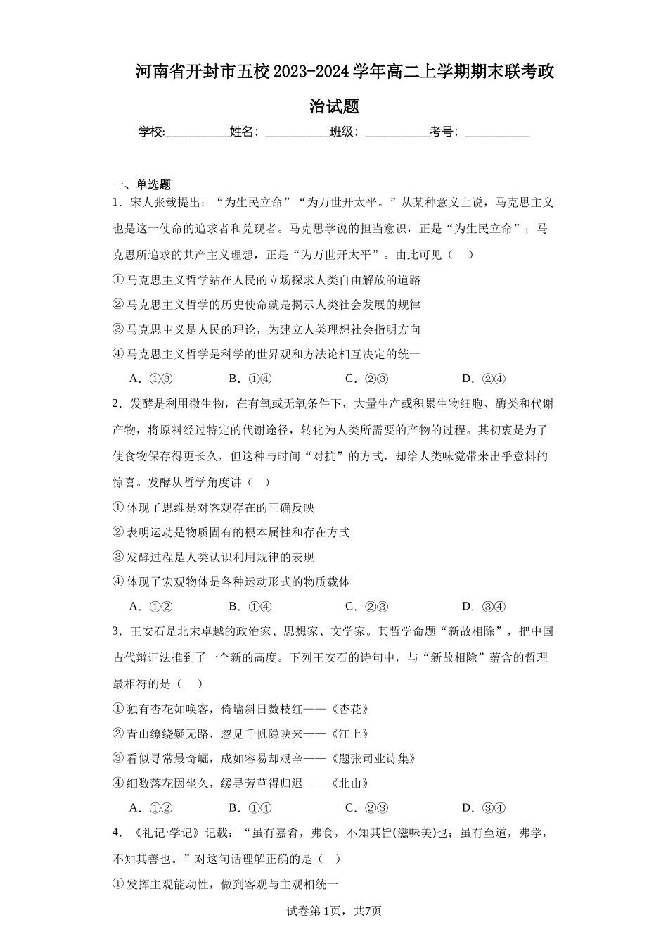 河南省开封市五校2023-2024学年高二上学期期末联考政治试题学校:___________姓名:___________班级:___________考号:___________一、单选题1.宋人张载提出:“为生民立命”“为万世开太平。”从某种意义上说,...