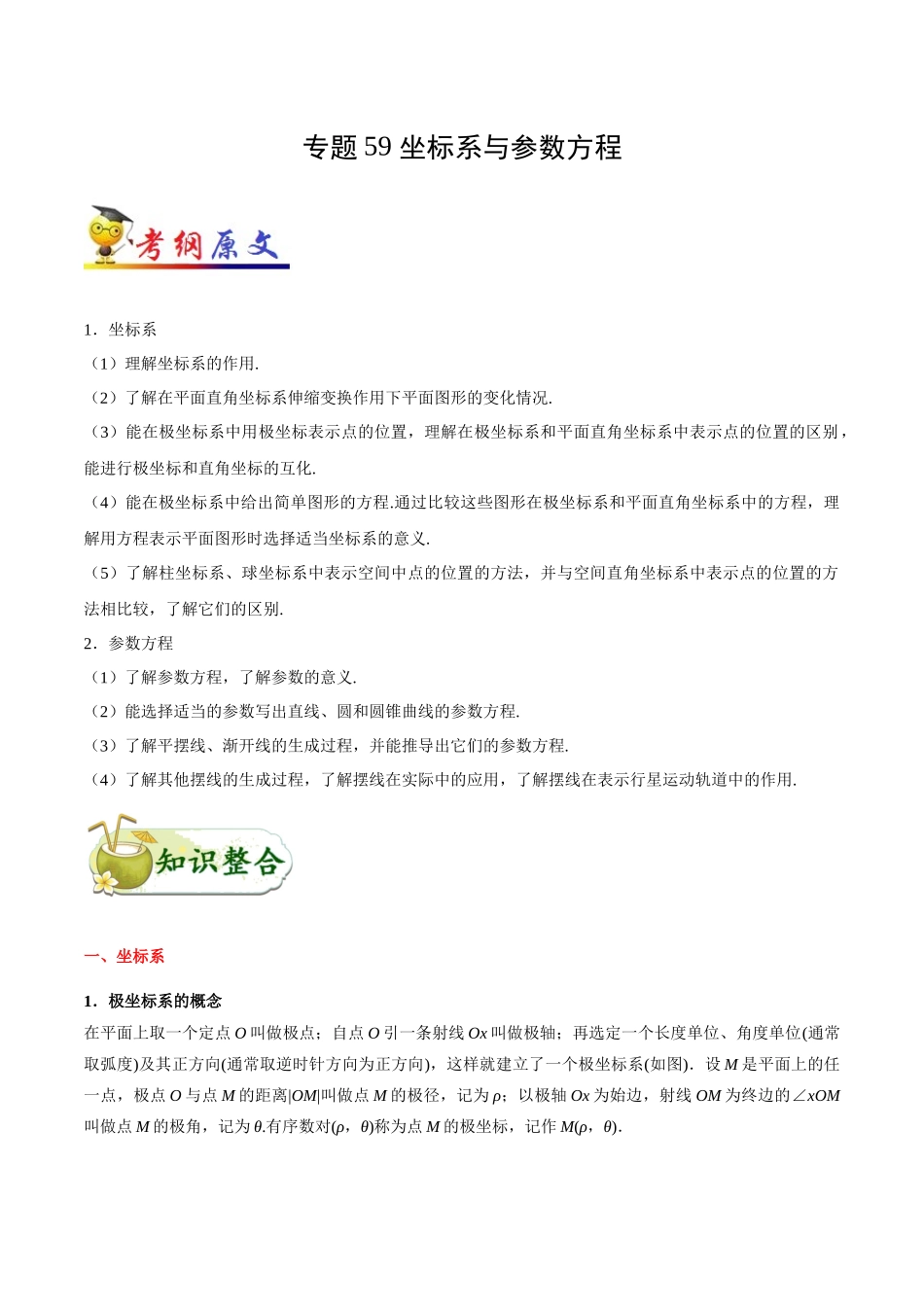 专题59坐标系与参数方程1.坐标系(1)理解坐标系的作用.(2)了解在平面直角坐标系伸缩变换作用下平面图形的变化情况.(3)能在极坐标系中用极坐标表示点的位置,理解在极坐标系和平面直角坐标系中表示点的位置...