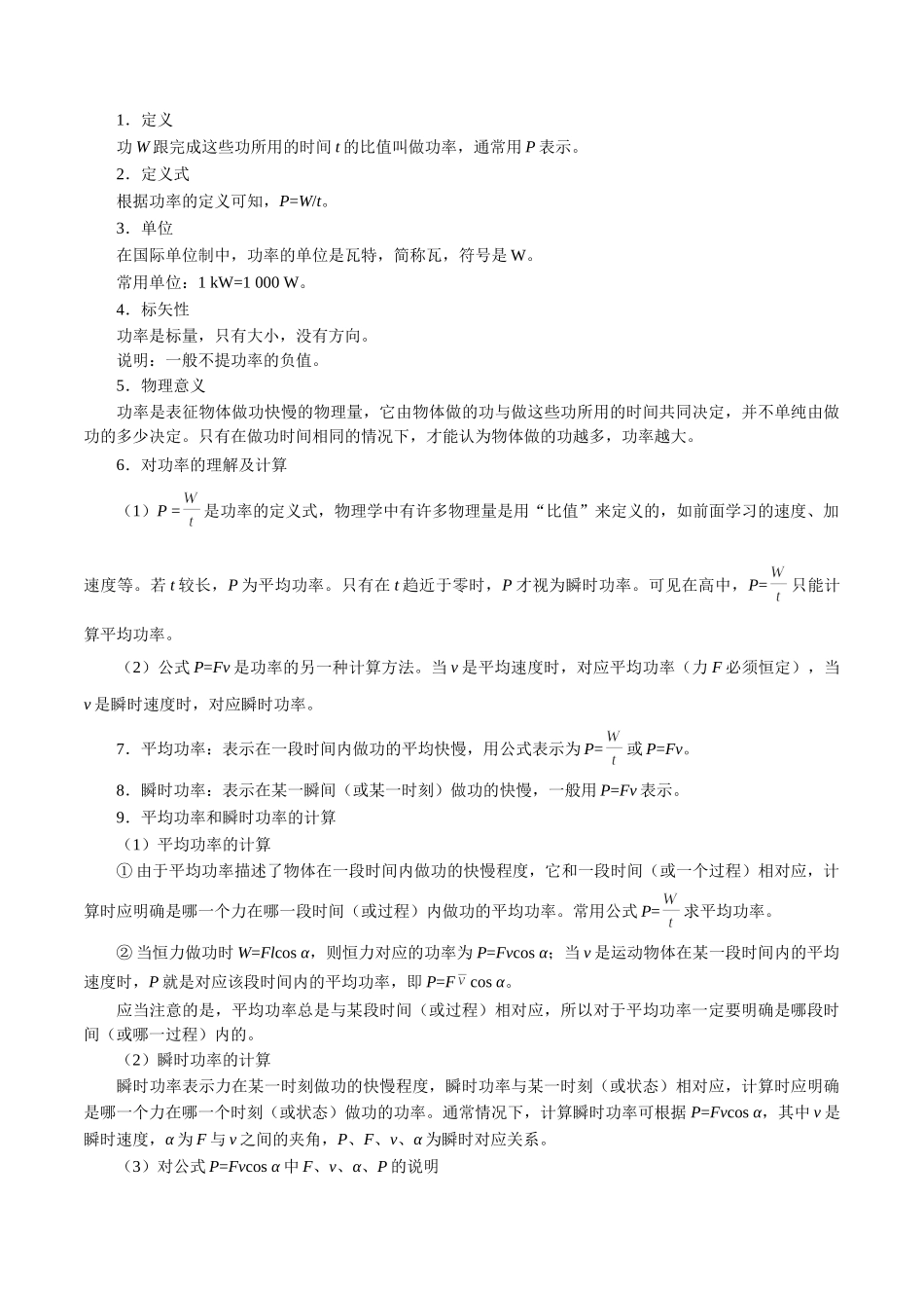 一、功1.概念:一个物体受到力的作用,并在力的方向上发生了一段位移,这个力就对物体做了功。2.做功的两个要素(1)物体受力的作用。(2)物体在力的方向上发生了位移。注意:两个要素缺一不可,因为有力不一...