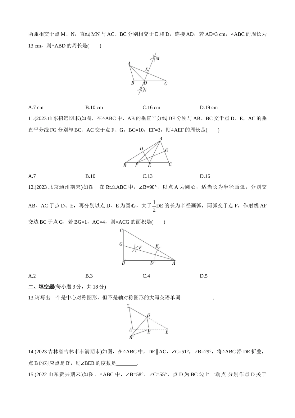 第十六章轴对称和中心对称综合检测(满分100分,限时60分钟)一、选择题(每小题3分,共36分)1.下列四幅图案中,不能通过平移图案得到的是()ABCD2.(2023河北廊坊安次期末)钢架雪车是2022年北京冬奥会的比赛项目之一....