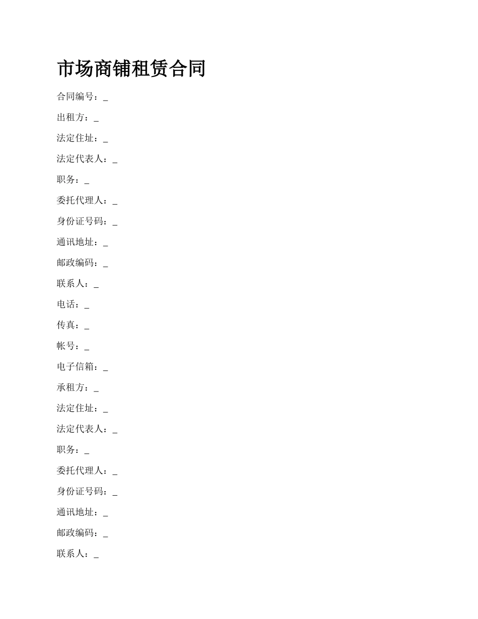 市场商铺租赁合同合同编号:_出租方:_法定住址:_法定代表人:_职务:_委托代理人:_身份证号码:_通讯地址:_邮政编码:_联系人:_电话:_传真:_帐号:_电子信箱:_承租方:_法定住址:_法定代表人:_职务:_...