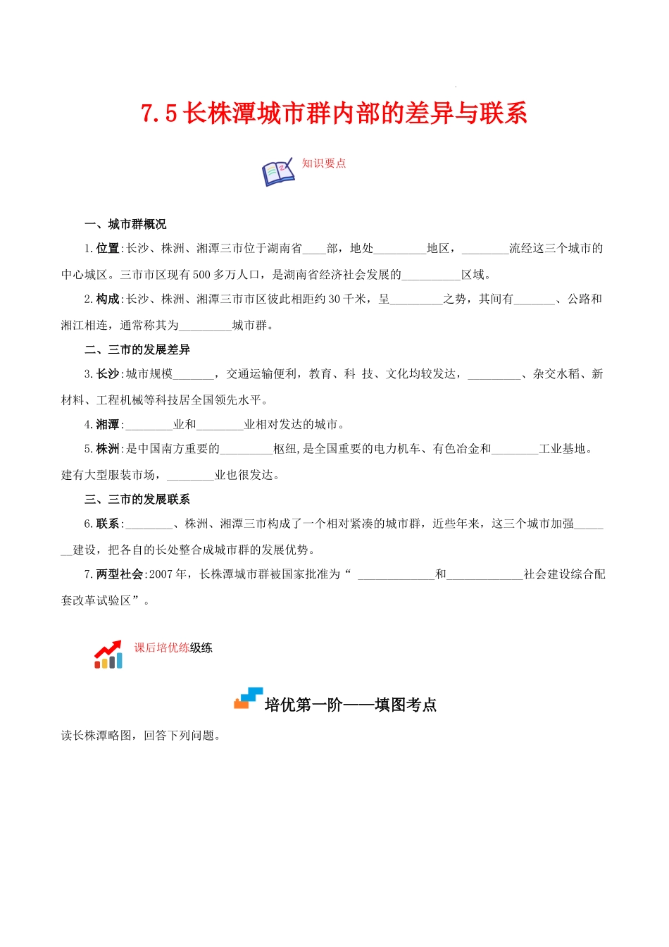 知识要点课后培优练级练7.5长株潭城市群内部的差异与联系一、城市群概况1.位置:长沙、株洲、湘潭三市位于湖南省____部,地处_________地区,________流经这三个城市的中心城区。三市市区现有500多万人口,是湖南...