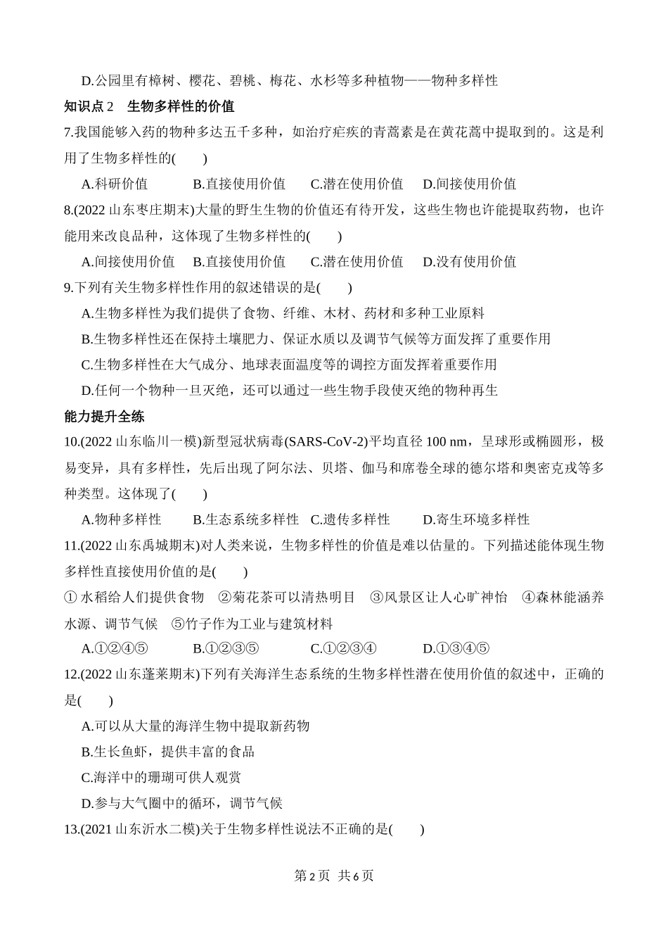 【八年级下册生物济南版】6.3.1 生物多样性 同步练习.docx_第2页