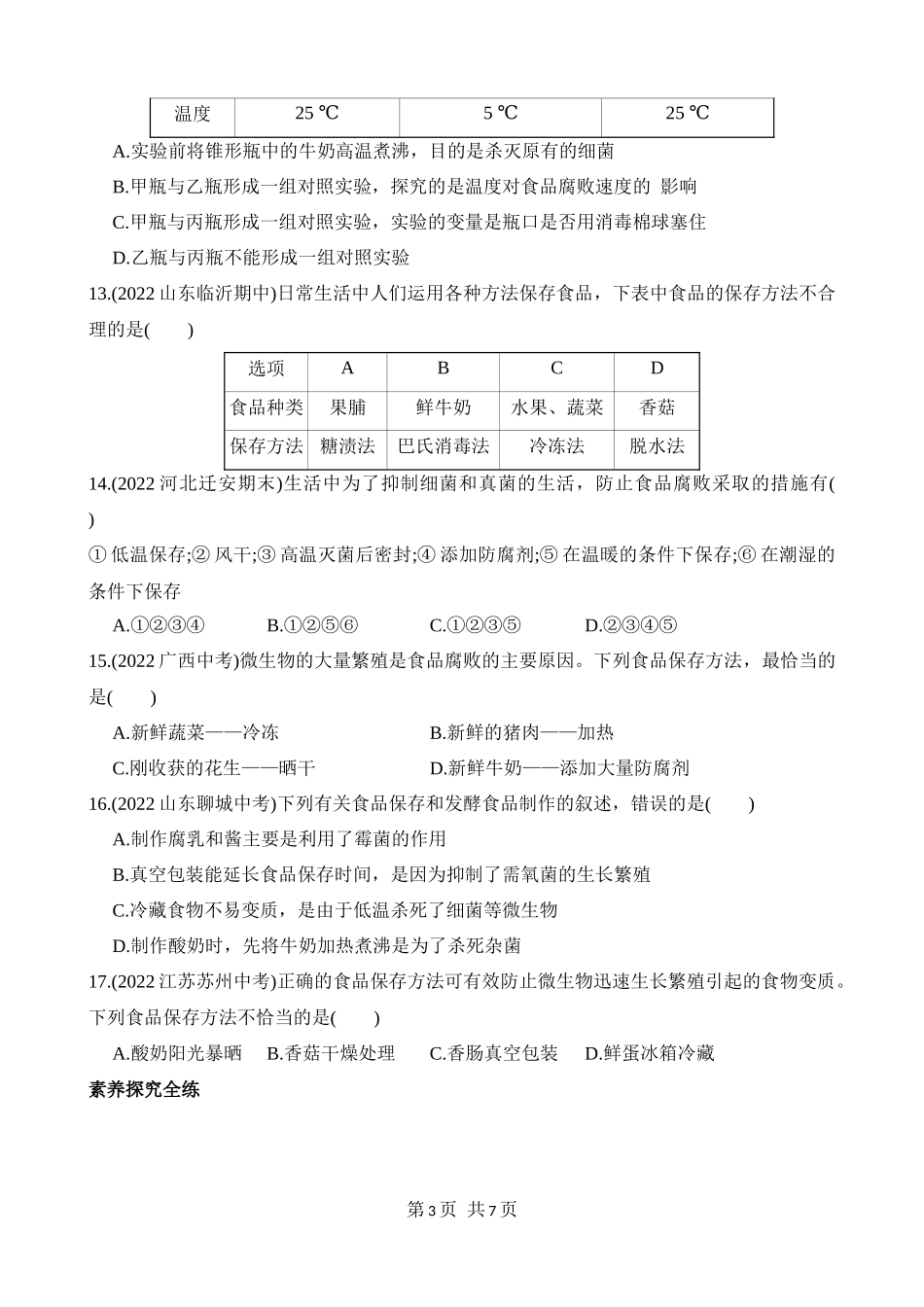 【八年级下册生物济南版】7.1.2 食品保存 同步练习.docx_第3页