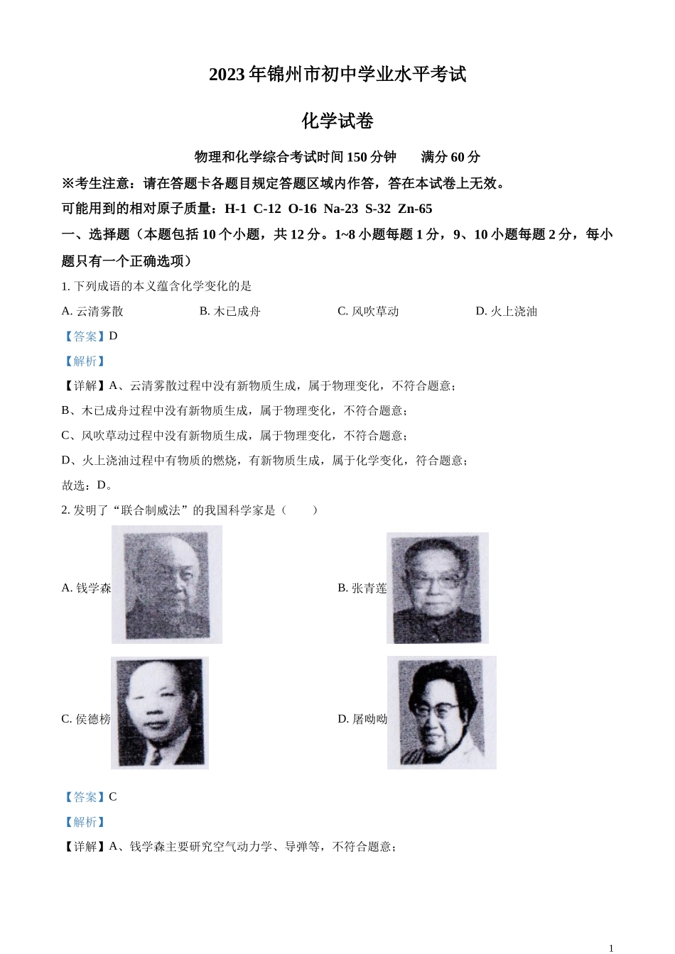 精品解析:2023年辽宁省锦州市中考化学真题(解析版).docx_第1页