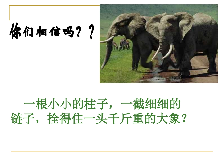 一根小小的柱子,一截细细的链子,拴得住一头千斤重的大象?在印度和泰国,驯象人在大象还是小象的时候,就用一条铁链将它绑在水泥柱或钢柱上,无论小象怎么挣扎都无法挣脱。小象渐渐地习惯了不挣扎,直到长成...