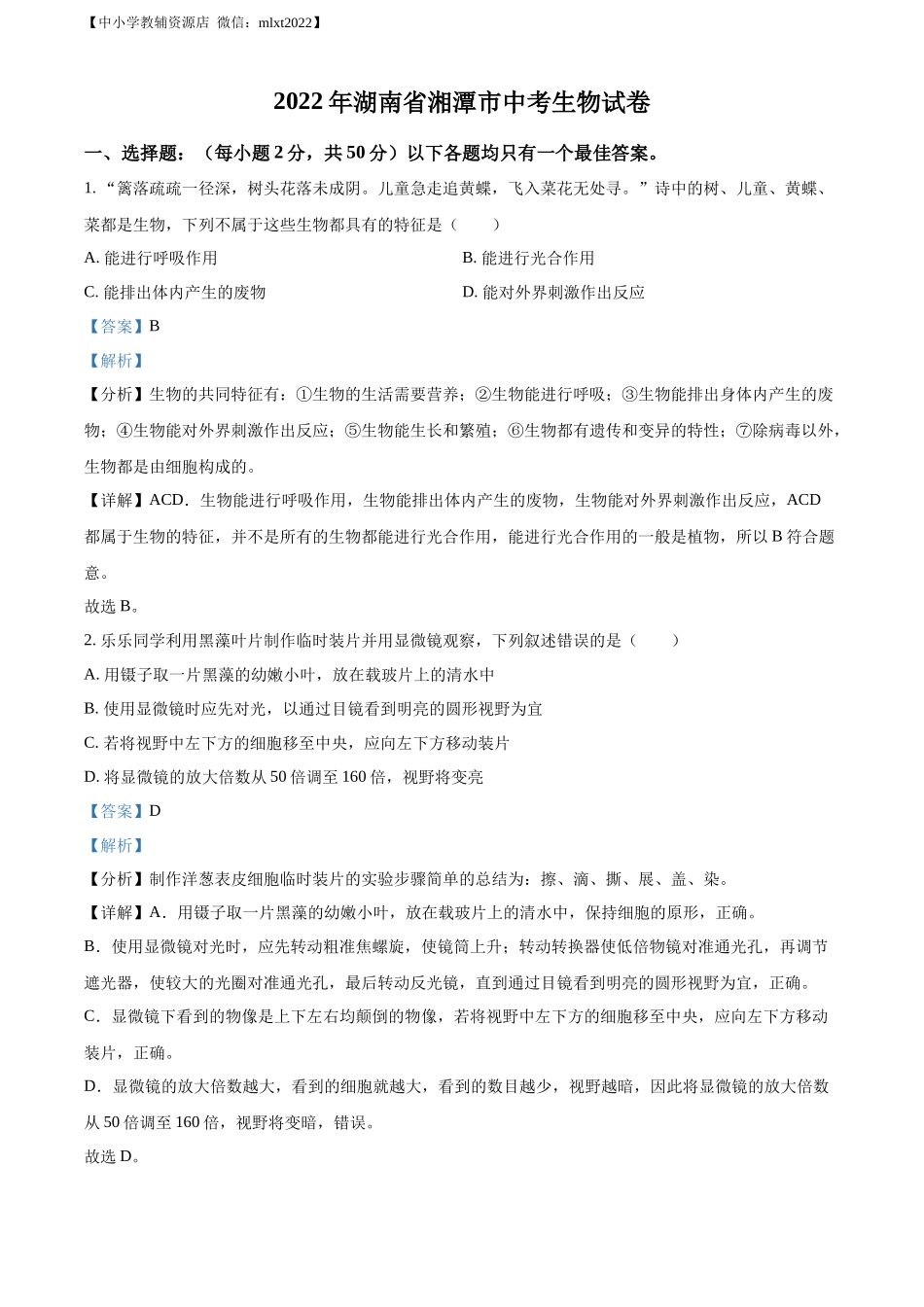 【中小学教辅资源店微信:mlxt2022】2022年湖南省湘潭市中考生物试卷一、选择题:(每小题2分,共50分)以下各题均只有一个最佳答案。1.“篱落疏疏一径深,树头花落未成阴。儿童急走追黄蝶,飞入菜花无处寻。”诗...