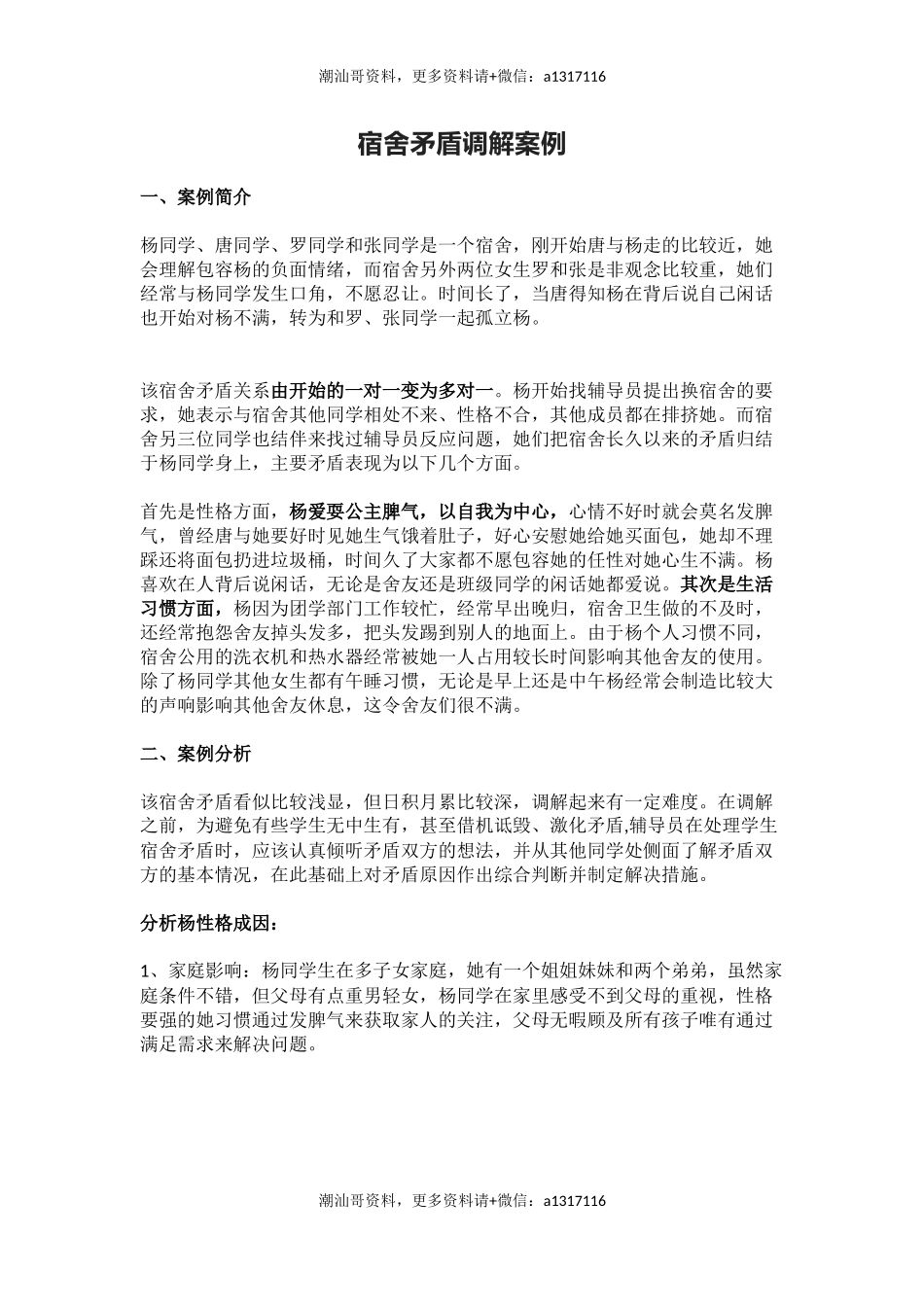 潮汕哥资料,更多资料请+微信:a1317116宿舍矛盾调解案例一、案例简介杨同学、唐同学、罗同学和张同学是一个宿舍,刚开始唐与杨走的比较近,她会理解包容杨的负面情绪,而宿舍另外两位女生罗和张是非观念比较重,...