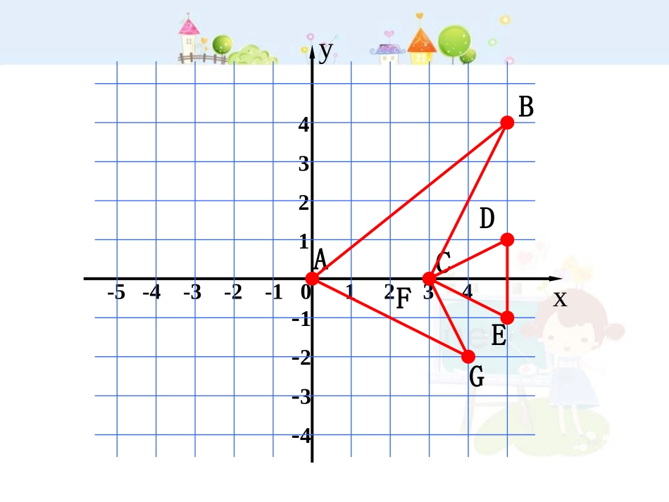 将坐标为A(0,0),B(5,4),C(3,0),D(5,1),E(5,-1),F(3,0),G(4,-2),的点用线段依次连结起来,观察所得图形,你看它像什么?问题1:yx-5-4-3-2-1012342134-1-2-3-4ABCDEFG如果将这个图形中的点A...