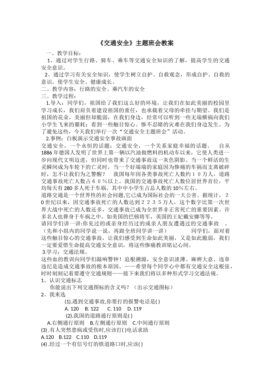 《交通安全》主题班会教案一、教学目标:1、通过对学生行路、骑车、乘车等交通安全知识的了解,提高学生的交通安全意识。2、通过学习有关安全知识,使学生树立自护、自救观念,形成自护、自救的意识,使学生安全...
