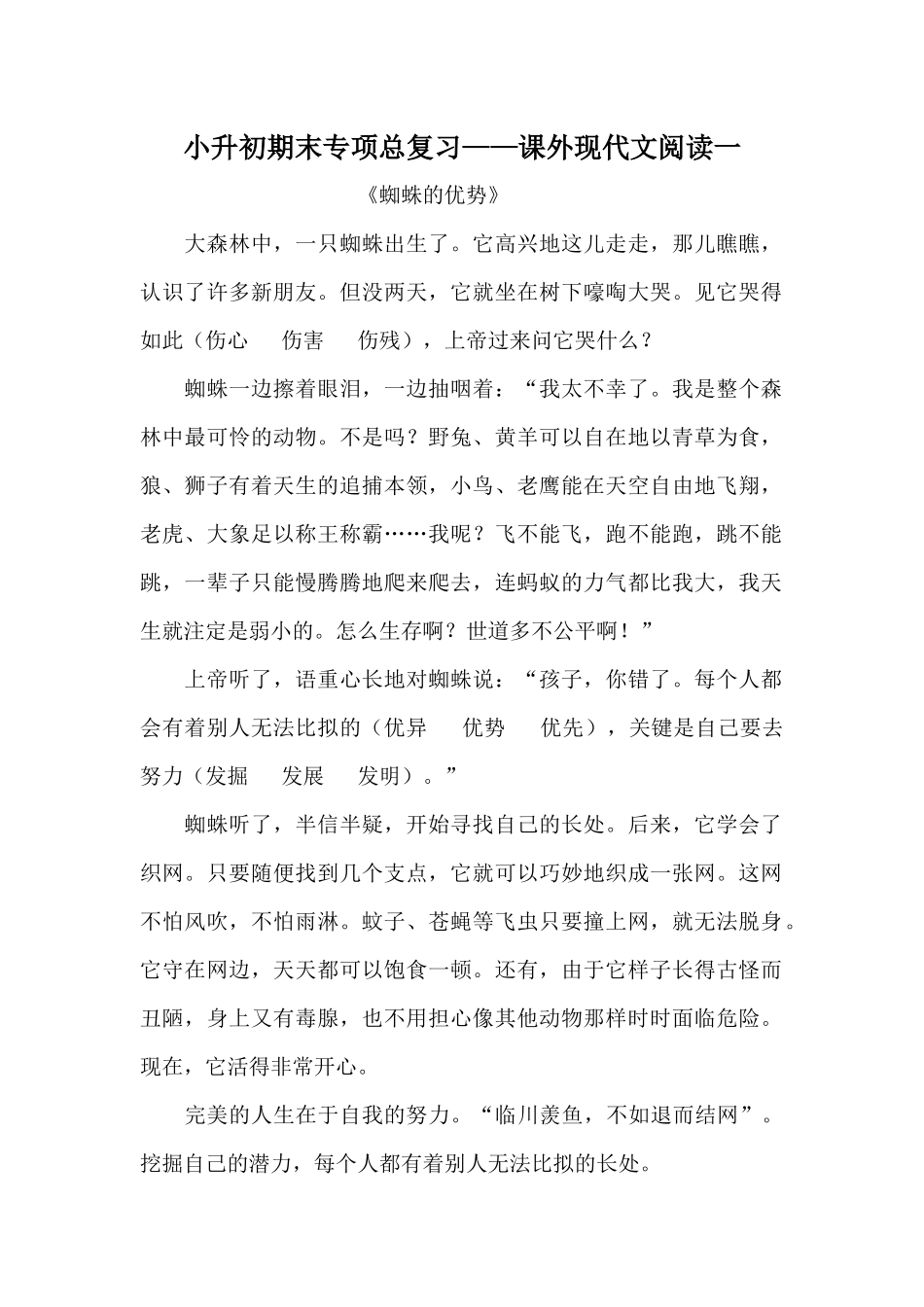 小升初期末专项总复习——课外现代文阅读一《蜘蛛的优势》大森林中,一只蜘蛛出生了。它高兴地这儿走走,那儿瞧瞧,认识了许多新朋友。但没两天,它就坐在树下嚎啕大哭。见它哭得如此(伤心伤害伤残),上帝过来...