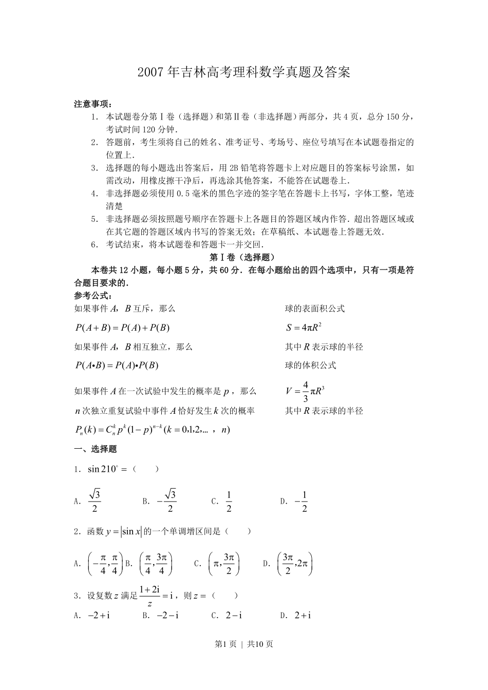 第1页|共10页2007年吉林高考理科数学真题及答案注意事项:1.本试题卷分第Ⅰ卷(选择题)和第Ⅱ卷(非选择题)两部分,共4页,总分150分,考试时间120分钟.2.答题前,考生须将自己的姓名、准考证号、考场号、座...