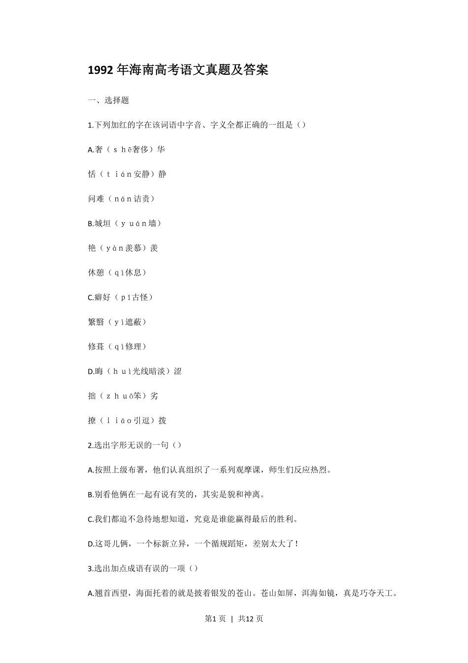 第1页|共12页1992年海南高考语文真题及答案一、选择题1.下列加红的字在该词语中字音、字义全都正确的一组是()A.奢(shē奢侈)华恬(tián安静)静问难(nán诘责)B.城垣(yuán墙)艳(yàn羡慕...