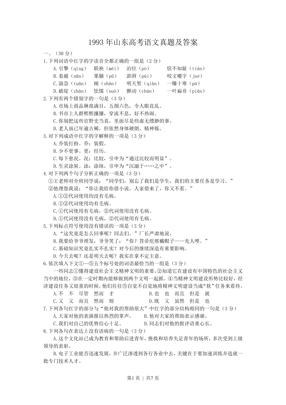 第1页|共7页1993年山东高考语文真题及答案一、(30分)1.下列词语中红字的字读音全都正确的一组是(2分)A.引擎(qíng)联袂(mèi)泊位(pò)恬不知耻(tián)B.羞赧(nǎn)果脯(pǔ)澎湃(pài)咬文嚼...