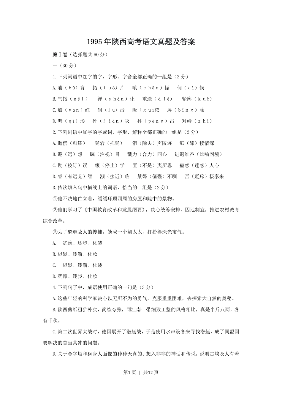 第1页|共12页1995年陕西高考语文真题及答案第Ⅰ卷(选择题共60分)一(30分)1.下列词语中红字的字,字形、字音全都正确的一组是(2分)A.哺(bǔ)育拓(tuò)片嗔(chēn)怪伺(cì)候B.气馁(něi...