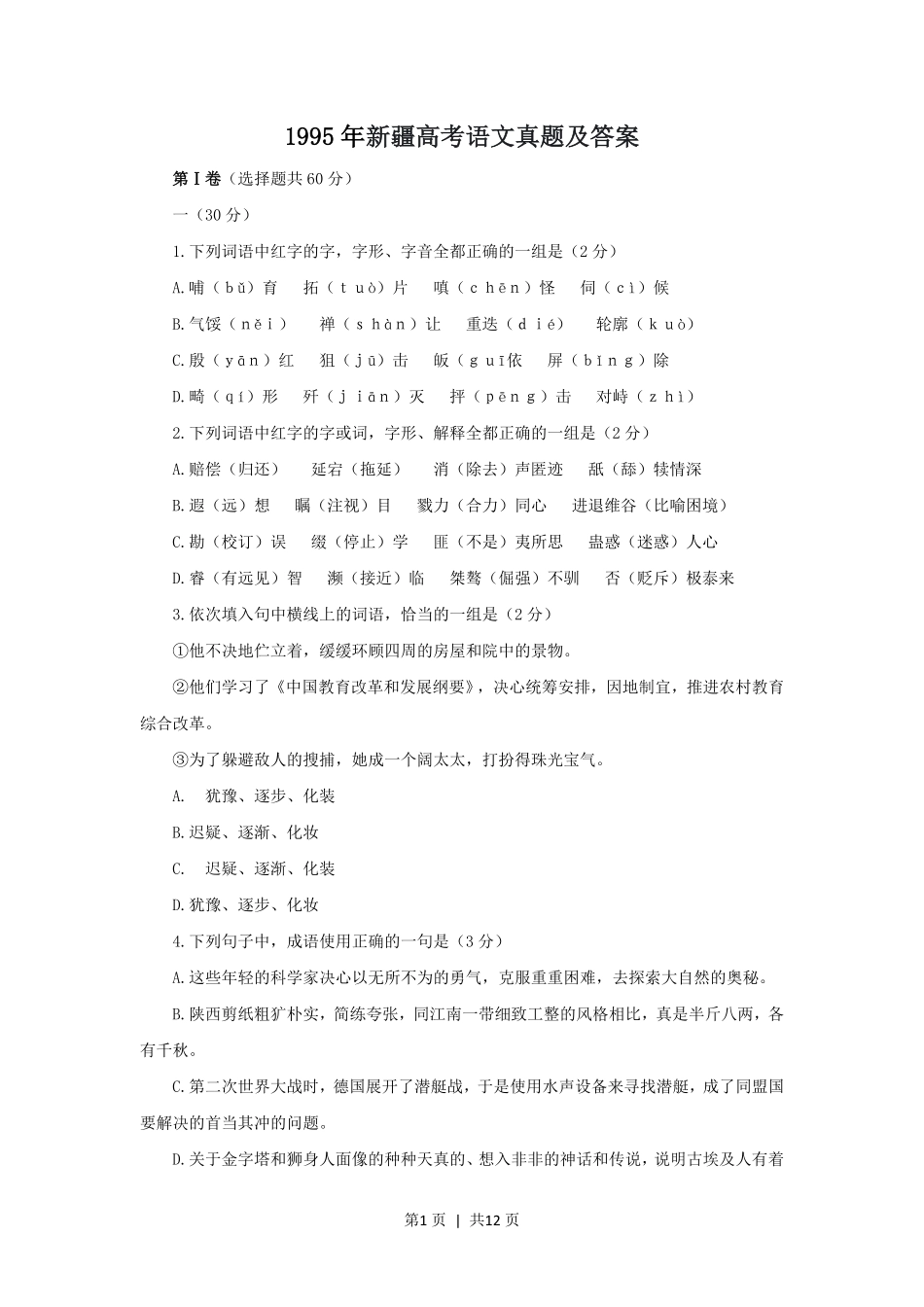 第1页|共12页1995年新疆高考语文真题及答案第Ⅰ卷(选择题共60分)一(30分)1.下列词语中红字的字,字形、字音全都正确的一组是(2分)A.哺(bǔ)育拓(tuò)片嗔(chēn)怪伺(cì)候B.气馁(něi...