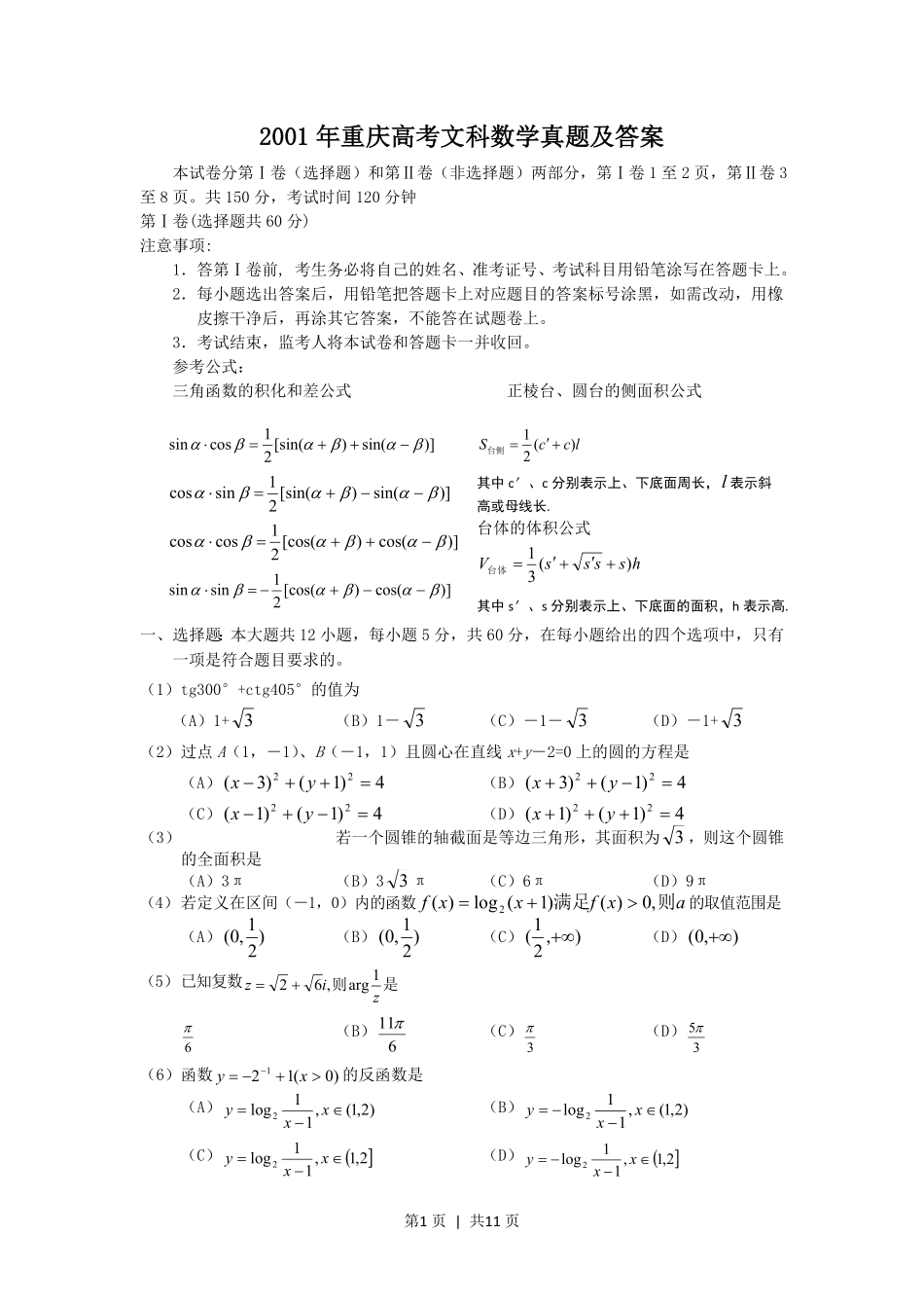 2001年重庆高考文科数学真题及答案.pdf_第1页