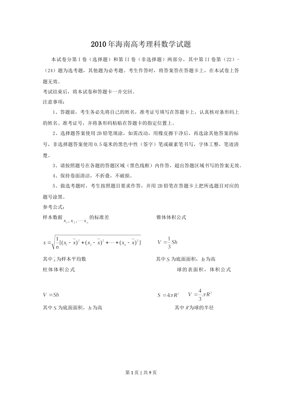 2010年海南高考理科数学试题本试卷分第I卷(选择题)和第II卷(非选择题)两部分,其中第II卷第(22)-(24)题为选考题,其他题为必考题。考生作答时,将答案答在答题卡上,在本试卷上答题无效。考试结束后,将...