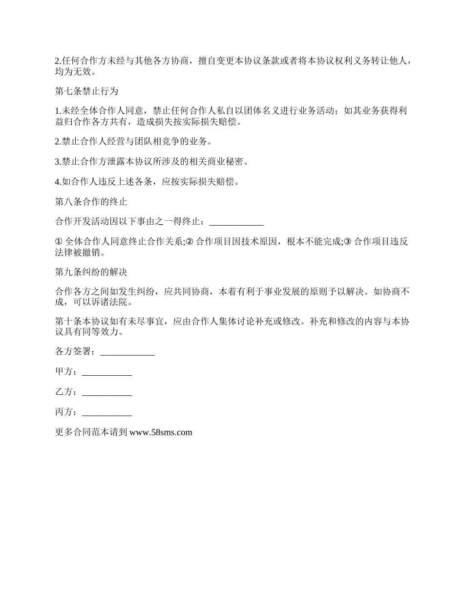 软件合作开发合同甲方:____________,身份证号乙方:____________,身份证号丙方:____________,身份证号丁方:____________,工商执照号鉴于__,协议各方均为计算机软件专业开发人员,能够进行创造性的软件开...