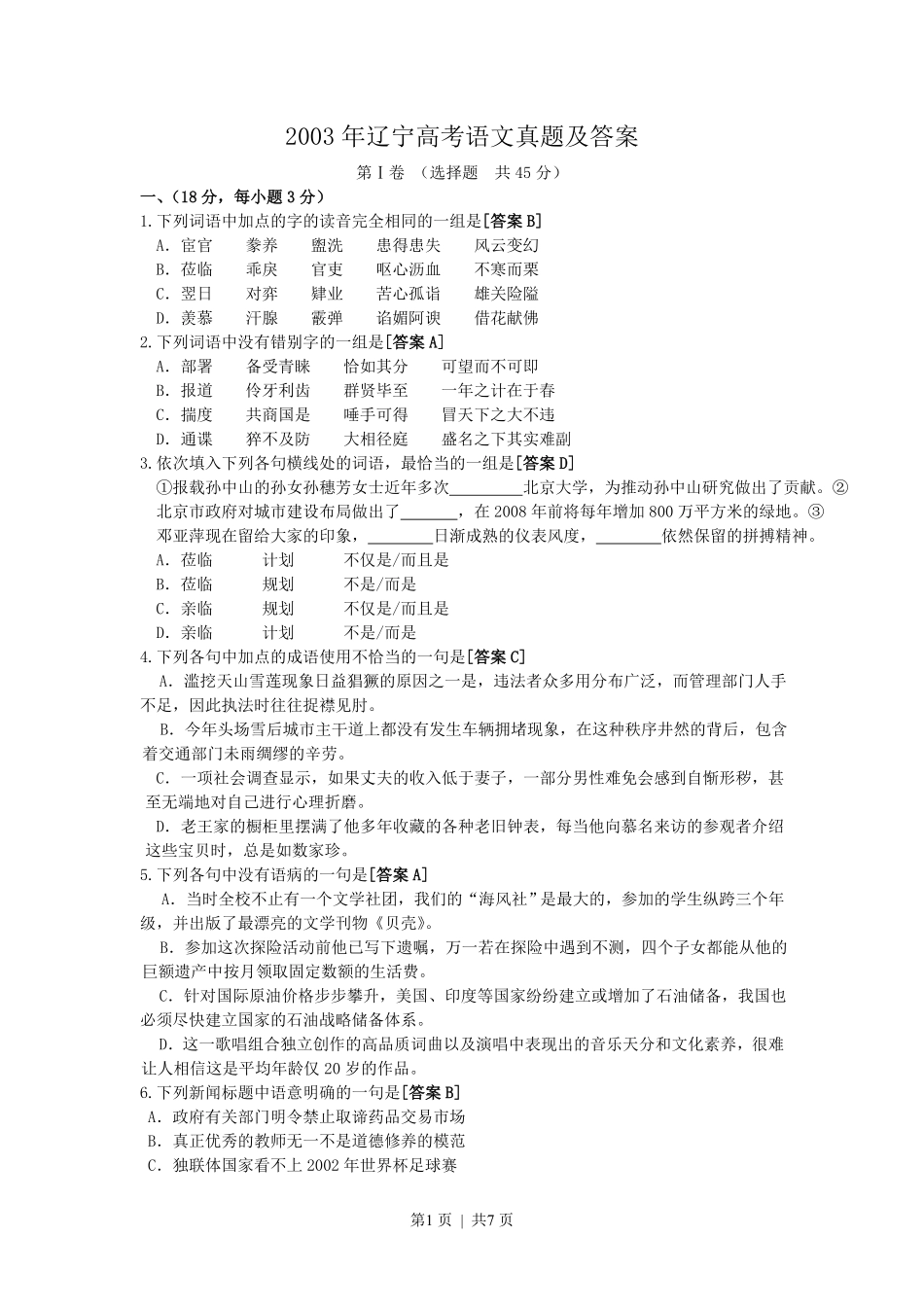 第1页|共7页2003年辽宁高考语文真题及答案第Ⅰ卷(选择题共45分)一、(18分,每小题3分)1.下列词语中加点的字的读音完全相同的一组是[答案B]A.宦官豢养盥洗患得患失风云变幻B.莅临乖戾官吏呕心沥血不寒而栗C...