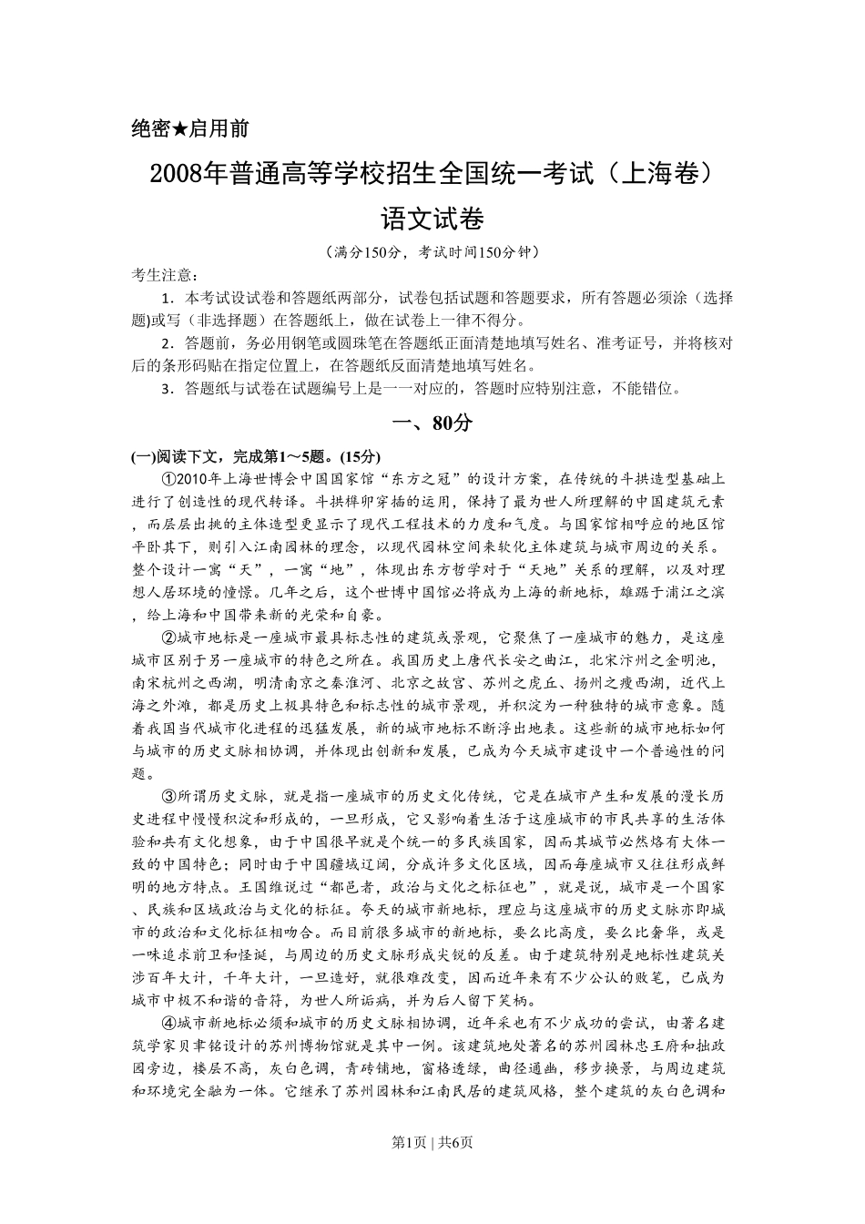 第1页|共6页绝密★启用前2008年普通高等学校招生全国统一考试(上海卷)语文试卷(满分150分,考试时间150分钟)考生注意:1.本考试设试卷和答题纸两部分,试卷包括试题和答题要求,所有答题必须涂(选择题)或写...