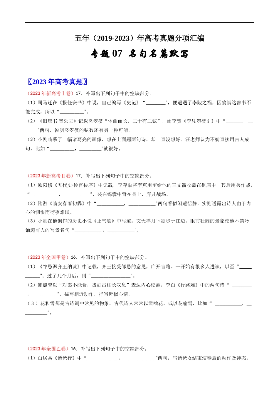 专题07 名句名篇默写-五年(2019-2023)高考语文真题分项汇编(全国通用) (原卷版).docx