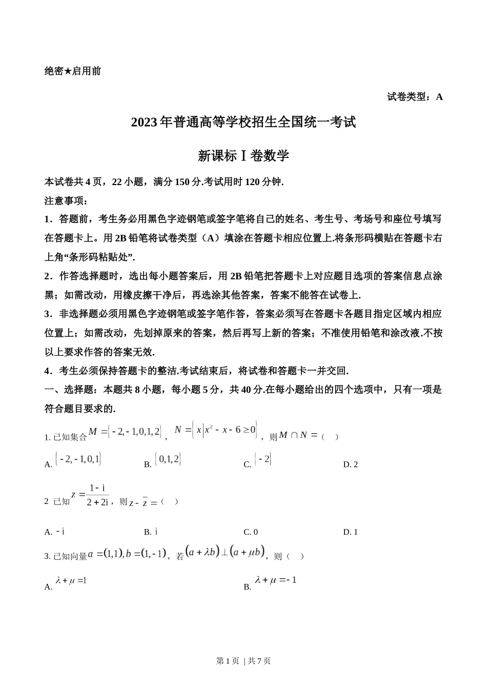 绝密★启用前试卷类型:A2023年普通高等学校招生全国统一考试新课标Ⅰ卷数学本试卷共4页,22小题,满分150分.考试用时120分钟.注意事项:1.答题前,考生务必用黑色字迹钢笔或签字笔将自己的姓名、考生号、考场号...